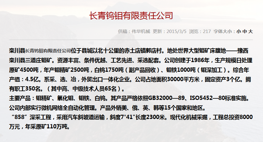 • 合作單位:長青鎢鉬有限責(zé)任公司